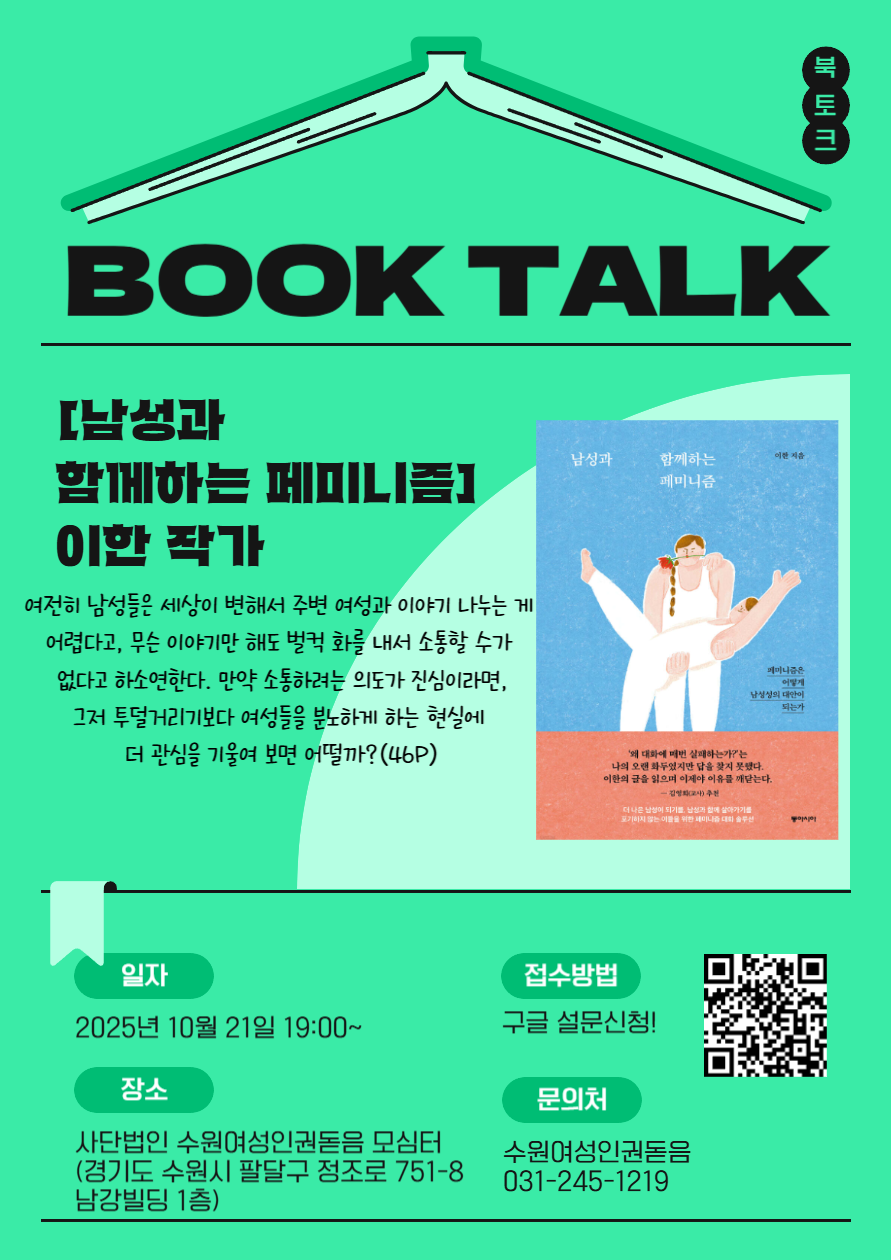 - 장소 : 수원여성인권돋음 모심터 (경기도 수원시 팔달구 정조로 751-8 남강빌딩 1층)