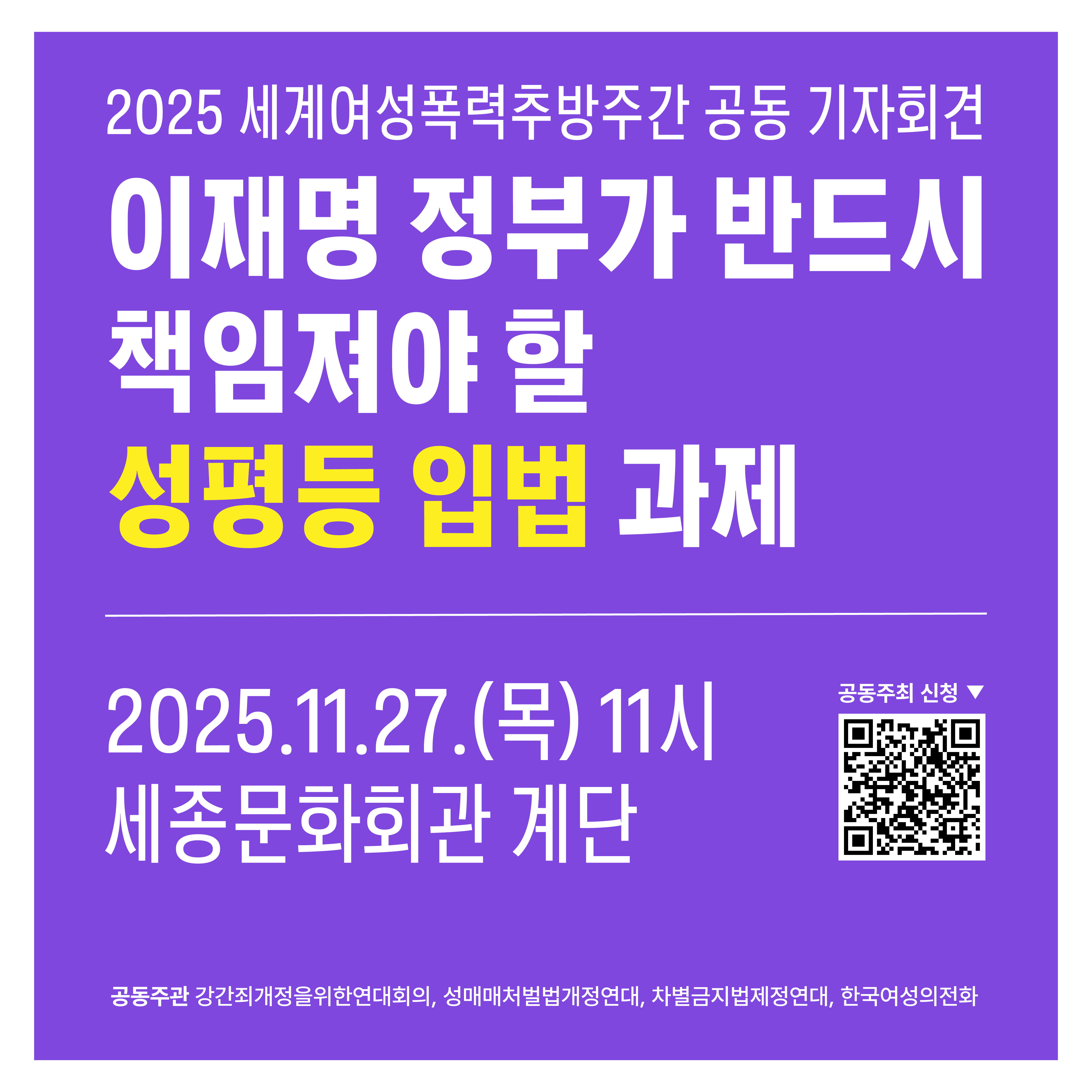 ‘2025 세계여성폭력추방주간’을 맞아 여성단체들이 27일 이재명 정부와 국회를 향해 성평등 입법 과제 실현을 촉구했다. 여성단체들은 이날 강간죄개정을위한연대회의와 모두의 안전한 임신중지를 위한 권리 보장 네트워크, 성매매처벌법개정연대, 차별금지법제정연대, 한국여성의전화 등이 공동 주관한 ‘2025 세계여성폭력추방주간’ 기자회견에서 “지금 필요한 것은 총체적인 구조적 성차별 해소를 통한 민주주의 회복”이라며 “성평등 입법 과제는 우선순위의 문제가 아니다. 구조적 성차별을 바로잡기 위해 하루라도 빨리 이뤄져야 할 긴급한 과제”라고 목소리를 높였다.