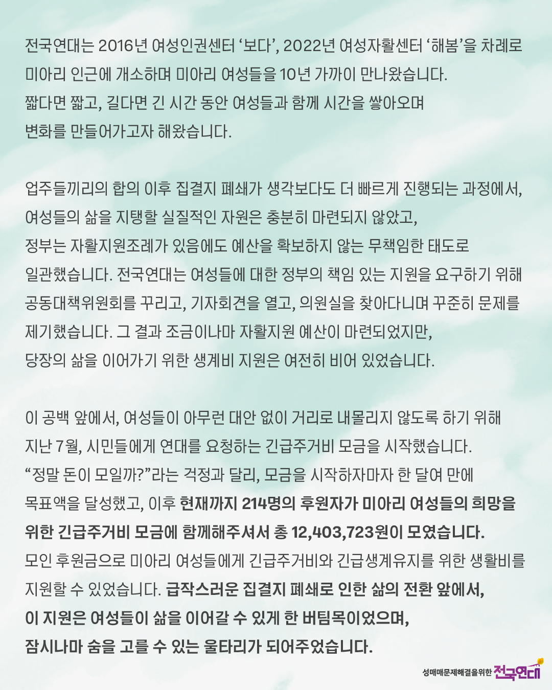 전국연대는 26일 논평을 통해 “‘탈성매매 지원금’은 모든 성매매 여성에게 보편적으로 지급되는 제도가 아니라, 집결지 폐쇄 과정에서 일부 지자체가 한시적으로 운영하는 특별 지원에 해당한다”며 “그럼에도 불구하고 전국적으로 보더라도 월 100만원을 초과하는 탈성매매 지원금은 존재하지 않는다”고 했다.