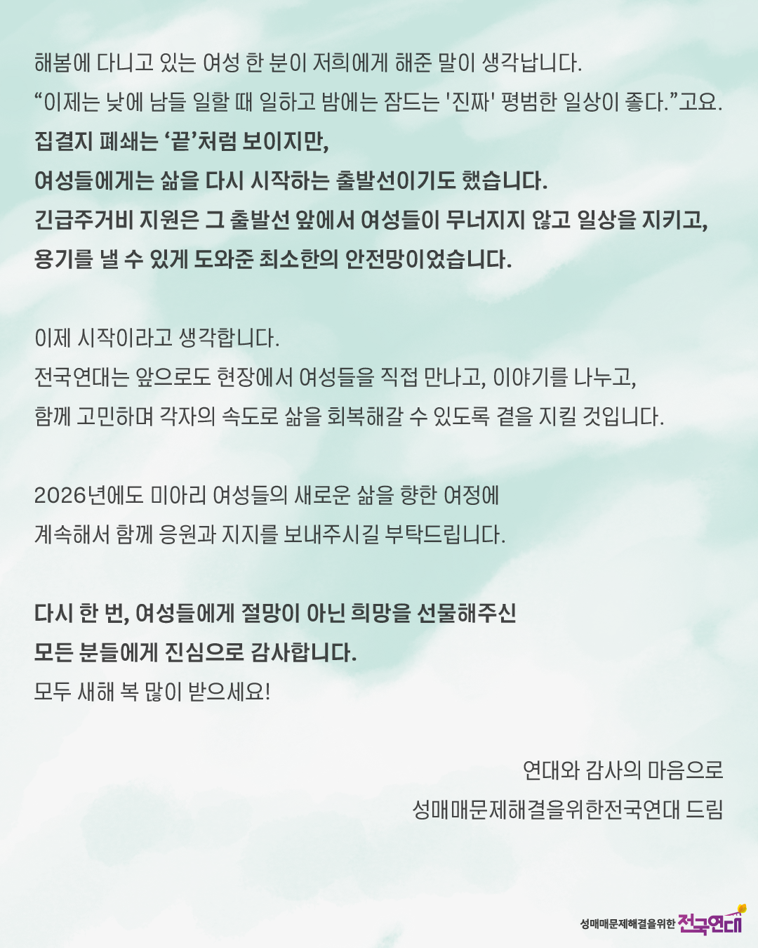 2026년에도 미아리 여성들의 새로운 삶을 향한 여정에 계속해서 함께 응원과 지지를 보내주시길 부탁드립니다. 다시 한 번, 여성들에게 절망이 아닌 희망을 선물해주신 모든 분들에게 진심으로 감사합니다.