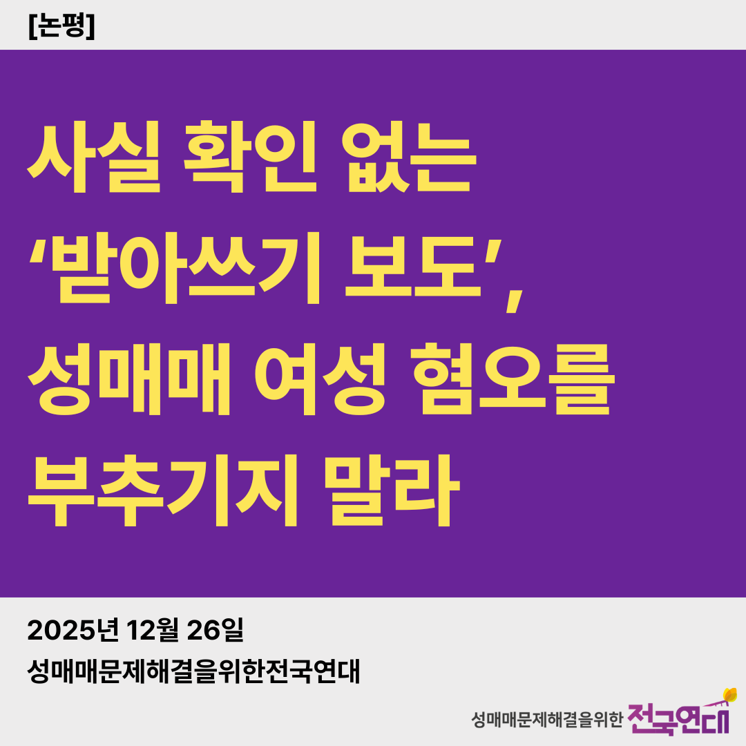 사실 확인 없는 기사, 왜곡된 숫자, 혐오 댓글을 그대로 옮겨 적는 보도는 결코 ‘제도 검증’이 아니다. 그것은 성매매 여성에 대한 편견과 혐오를 확대 재생산하는 폭력이다. 언론은 지금이라도 선정적인 프레임에서 벗어나, 탈성매매 지원제도의 실제 현실과 그 사회적 의미를 책임 있게 보도해야 할 것이다.