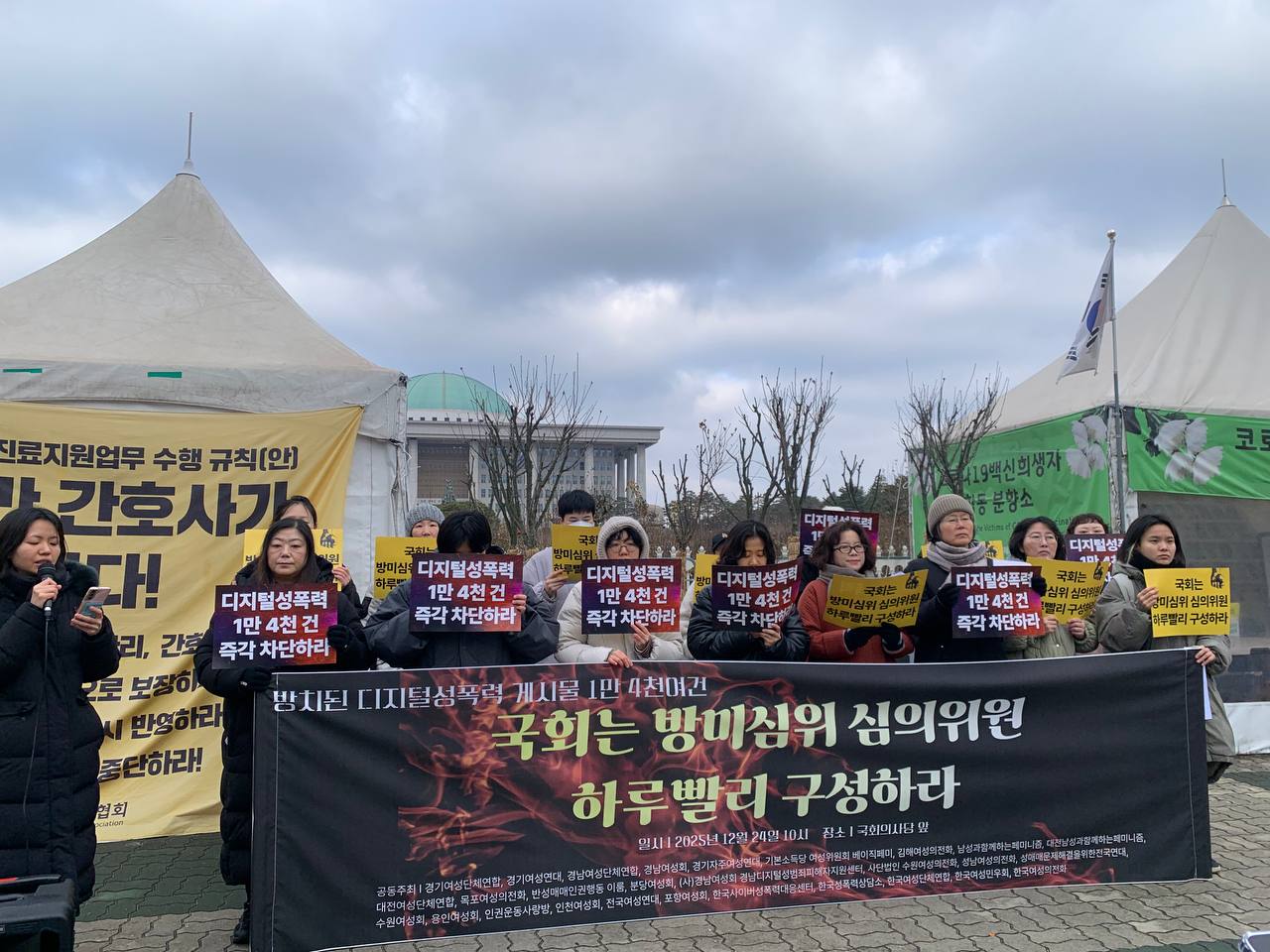 한편 불법 사이트의 접속을 차단해야하는 방송통신미디어심의위원회(이하 방미심위)는 10월 1일 출범했으나, 지금까지 심의위원은 단 한 명도 선임되지 않았습니다. 지난 6월 이후로 심의가 중단되어 10월 2일 기준 디지털성폭력 게시물 1만 4천여건이 사실상 방치되고 있습니다. 이에 국회에 방미심위 심의위원을 하루 빨리 구성하기를 요구하는 기자회견을 지난 12월 24일 국회 앞에서 진행했습니다. 전국연대도 공동주최 단위로 함께 했습니다.